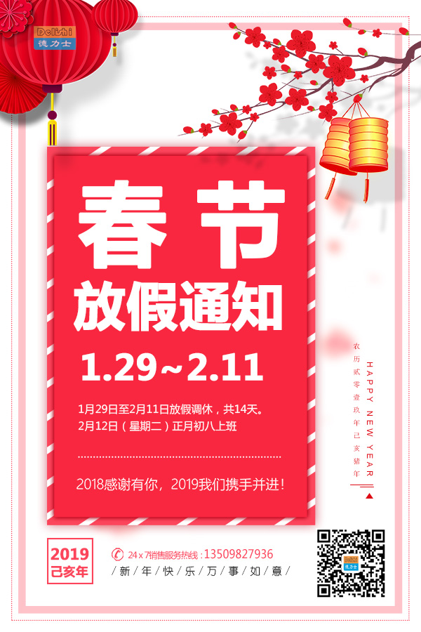 2018年匆匆过去,我们迎来了2019年。再过十来天,中国传统重大节日-春节就来临了。为了感谢beat365同仁们,18年辛勤的付出,特此我司春节假期安排如下:1月29日-2月11日春节调休,共计14天。春节假期,7*24小时销售服务热线13509827936 。在此,beat365液压机械提前祝贺:各位新老客户生意兴隆,阖家安康!